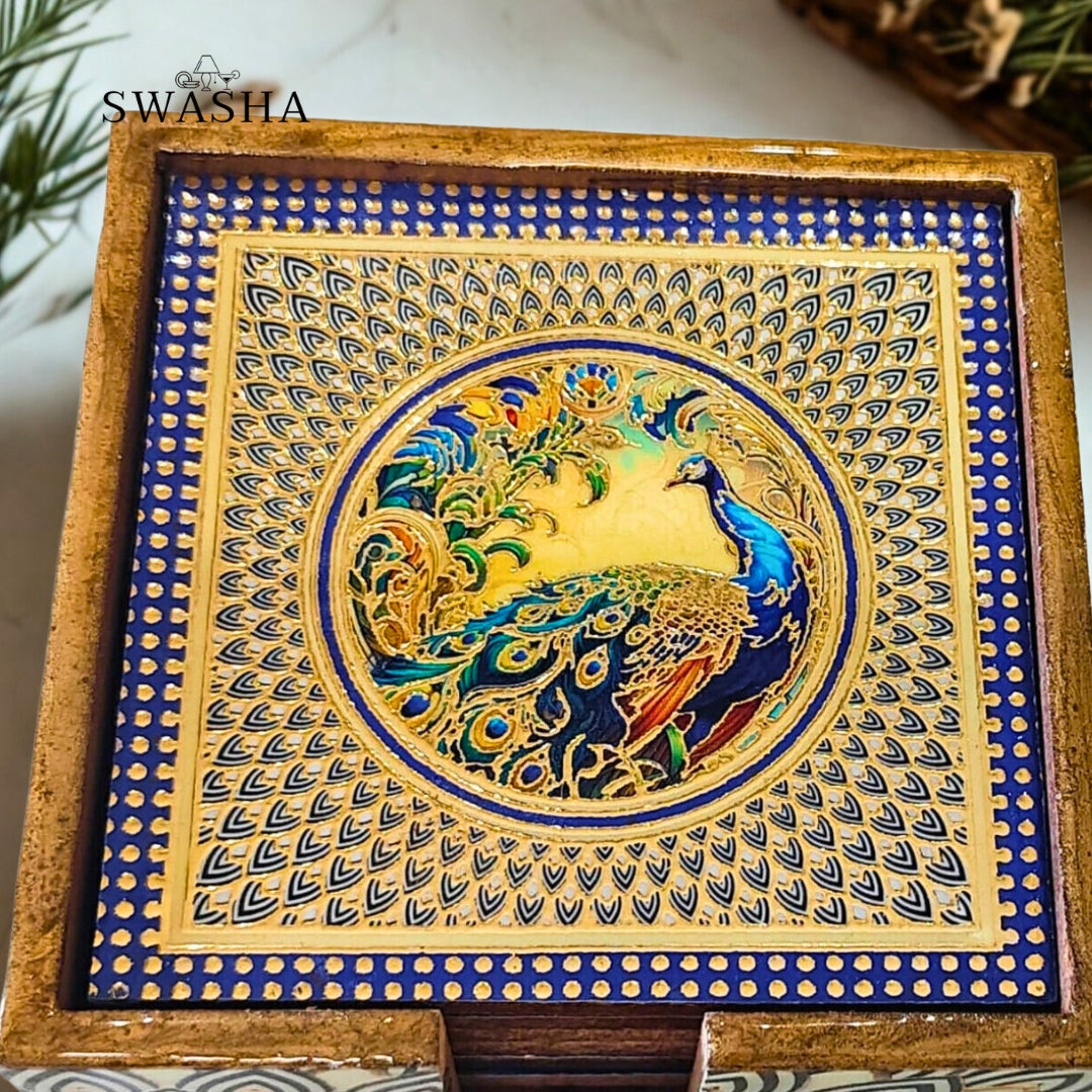 Enhance your dining and coffee experience with the Swasha Wooden MDF Coaster Set of 4. Crafted from premium MDF and finished with a glossy resin coat, these coasters are designed to protect your table from water rings, heat, and scratches. Their stylish printed design adds a touch of elegance to any setting, making them perfect for everyday use or as a thoughtful gift. Durable, easy to clean, and beautifully crafted, these coasters are an essential addition to modern tableware.
