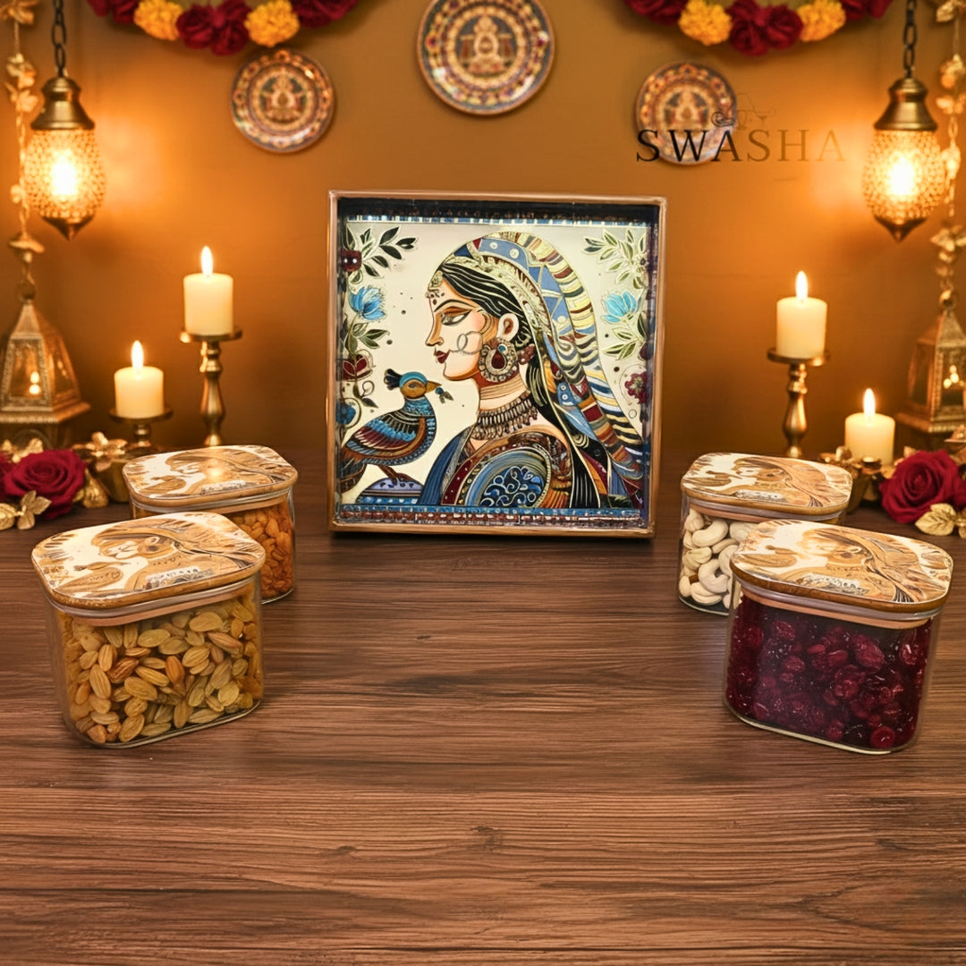 Keep your kitchen stylish and organized with the Swasha Storage Jars with MDF Tray (Set of 4). Featuring multicolor jars in unique designs with a glossy resin finish, this set is perfect for storing dry fruits, snacks, spices, or condiments. The MDF wooden tray adds charm and functionality, making it ideal for both everyday use and serving guests.