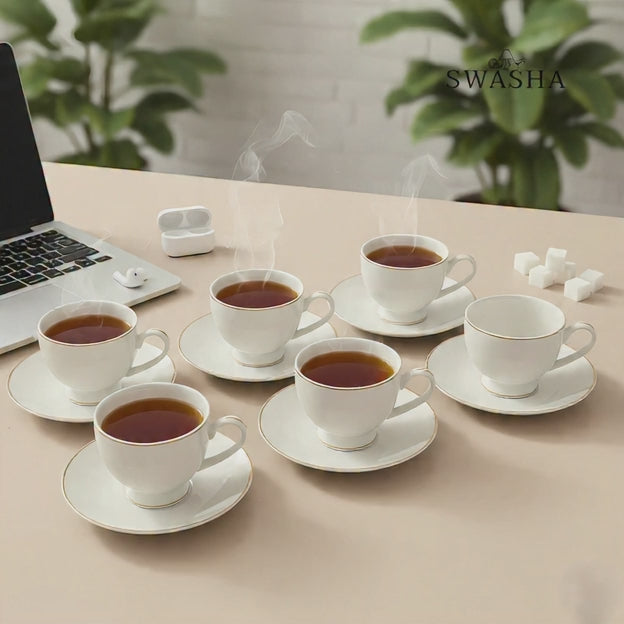 Enjoy every sip with Swasha’s premium porcelain cup saucer set. Includes 6 cups & 6 saucers, designed for style and durability. Perfect for serving tea & coffee.